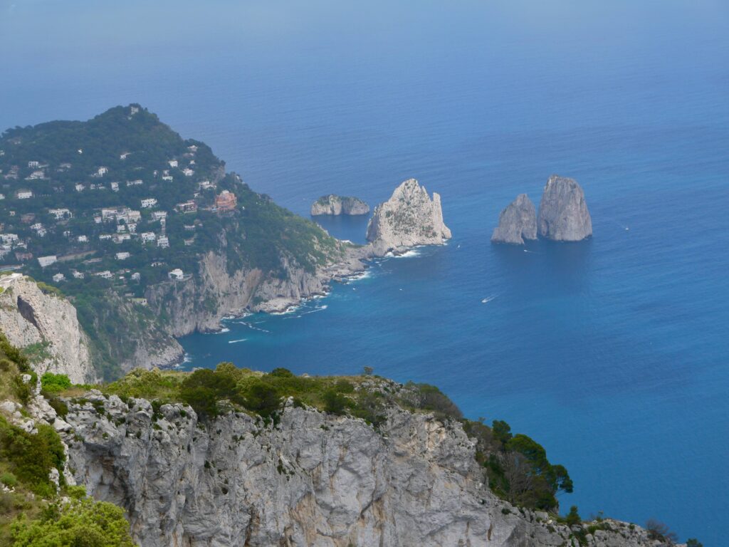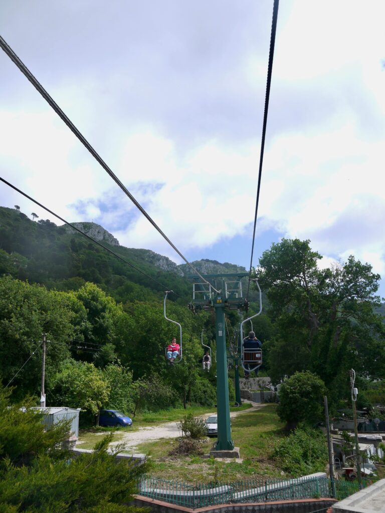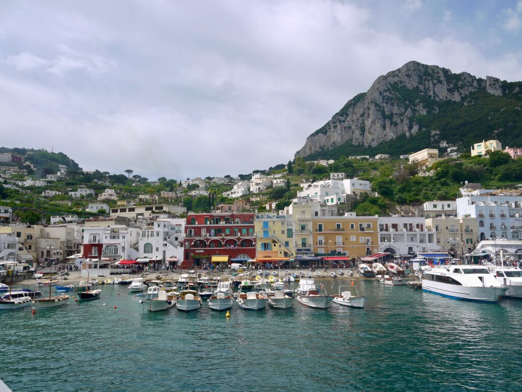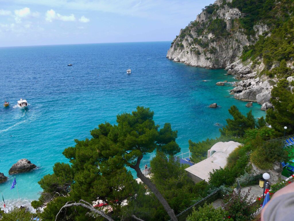 L’île est divisée en deux principales localités, Anacapri et Capri. Capri, la principale ville, est située sur la côte nord de l’île et est célèbre pour ses boutiques de luxe, ses restaurants élégants et ses hôtels de charme. Anacapri, située à une altitude plus élevée, offre une atmosphère plus paisible et une vue panoramique sur l’île. Il n’y a pas de voitures dans l’île hormis les taxis locaux, les bus, les bateaux, le funiculaire et même un télésiège. Nous conseillons de passer au moins une nuit à Capri pour avoir le temps de visiter. Nous avions opté pour un hôtel à Marina Piccola