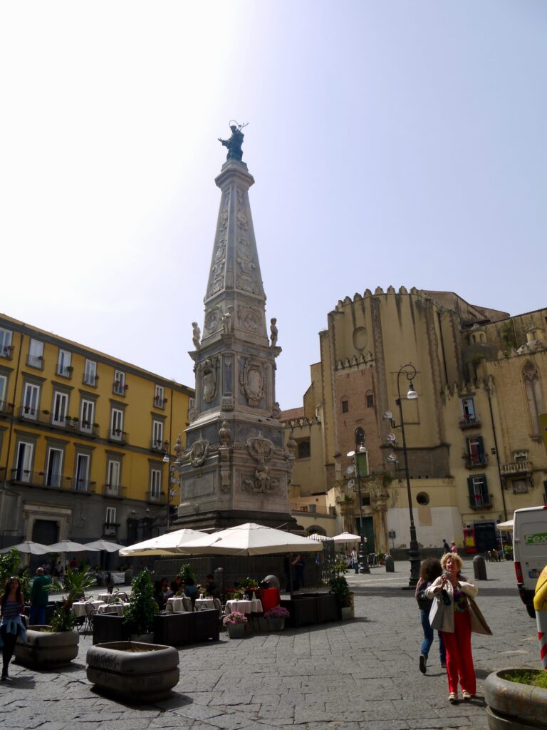 Place élégante entourée de bâtiments historiques, dont l’église du Gesù Nuovo et le monastère de Santa Chiara. L’atmosphère y est particulièrement animée.