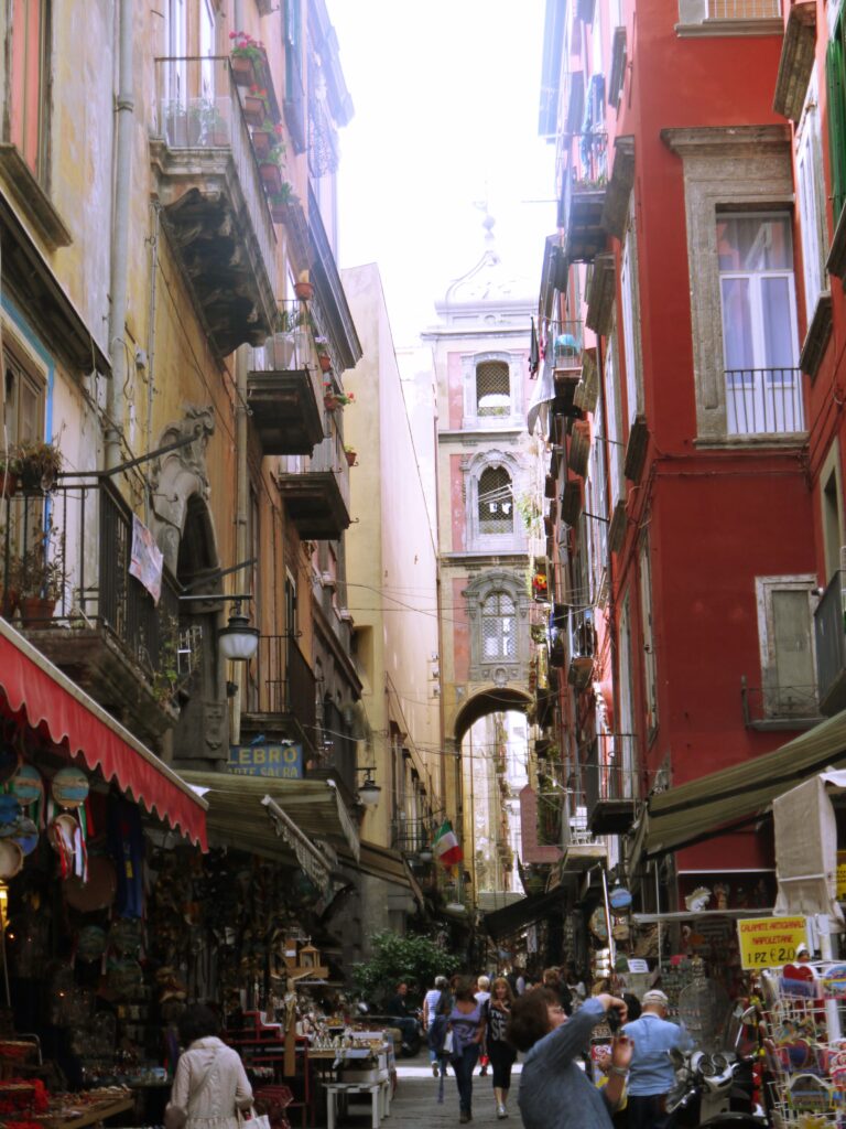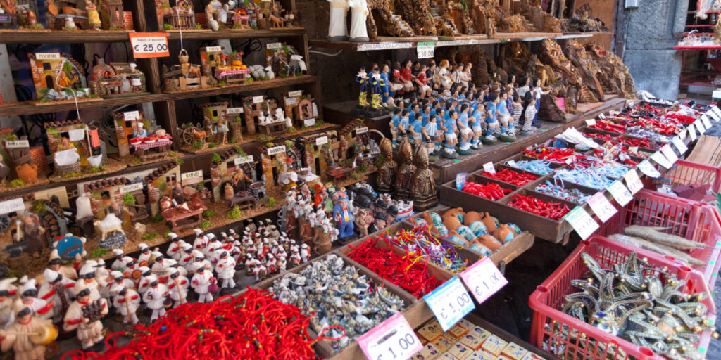 Une autre rue animée, célèbre pour ses boutiques proposant des figurines et des objets liés à la tradition locale des crèches de Noël ou du fameux Polichinelle, bouffon du théâtre napolitain.