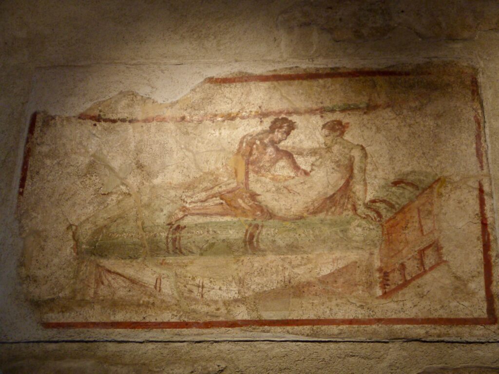 Le Lupanar était une maison close à Pompéi. Les fresques murales à l’intérieur décrivent des scènes érotiques et fournissent un aperçu de la vie quotidienne et des mœurs de l’époque.
