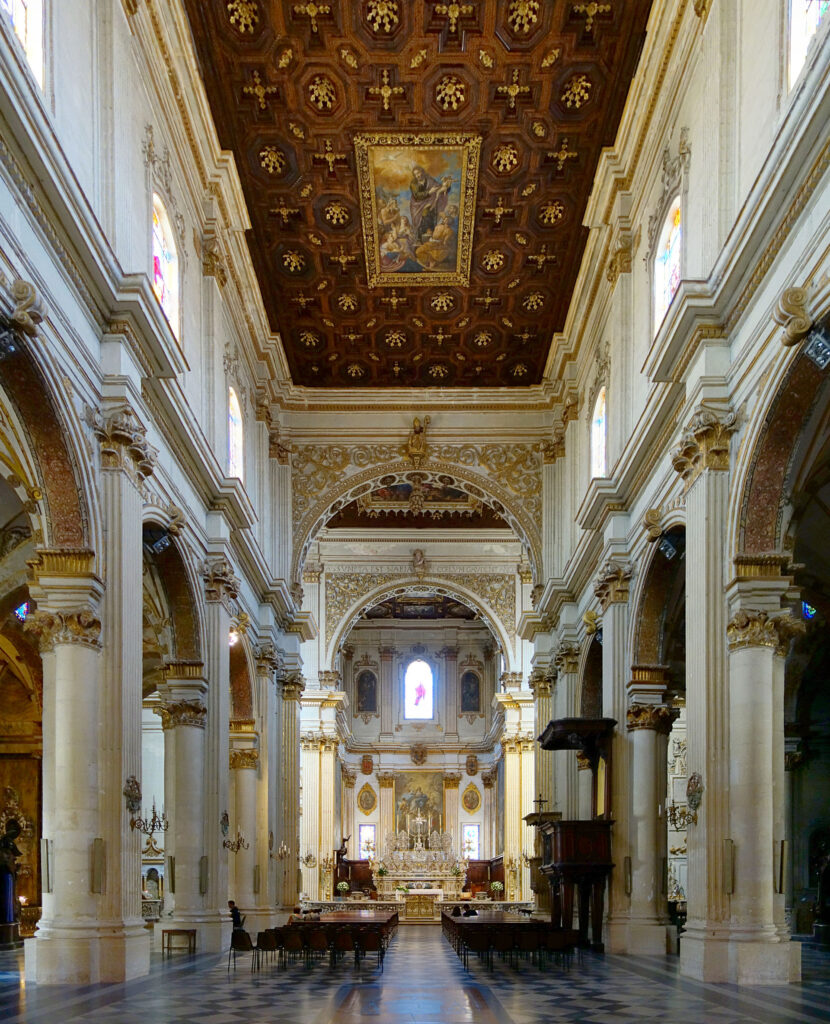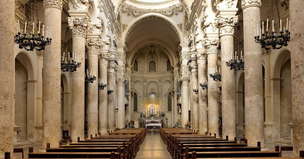 L’intérieur de l’église de San Matteo est tout aussi magnifique, avec des fresques, des sculptures et des autels en marbre. Une caractéristique notable de l’église de San Matteo est son plafond à caissons, décoré de peintures représentant des scènes bibliques et des symboles religieux. C’est un exemple remarquable de l’art baroque leccese.