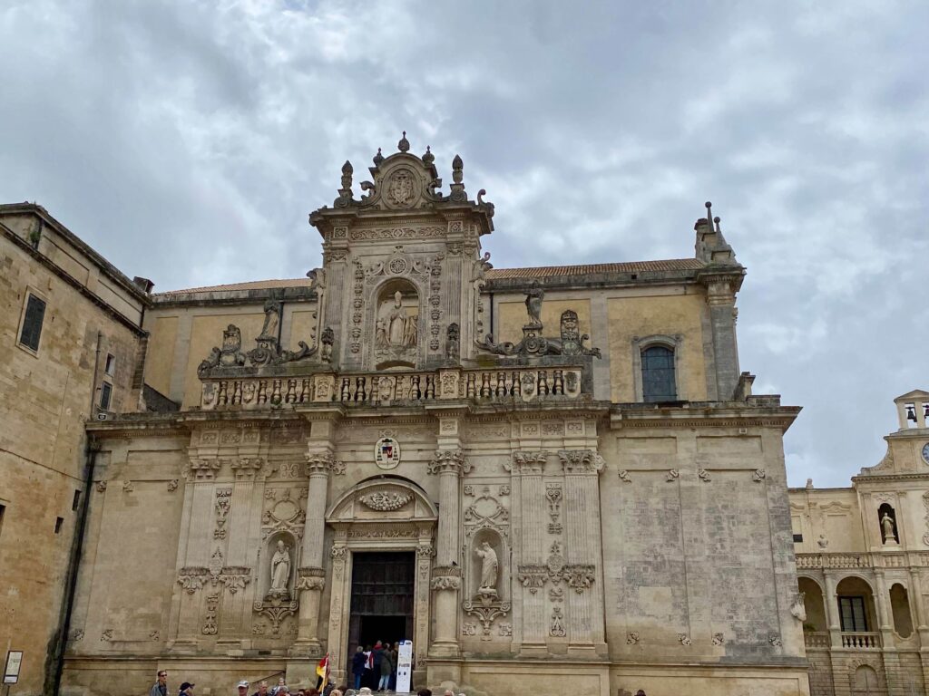 La place est entourée de magnifiques bâtiments baroques, qui témoignent du riche patrimoine architectural de Lecce. Au centre de la Piazza del Duomo se dresse la cathédrale de Lecce, également connue sous le nom de Duomo di Lecce, un chef-d’œuvre de l’architecture baroque leccese. La façade de la cathédrale est ornée de sculptures et de décorations complexes, offrant un spectacle visuel impressionnant. Nous avons fait la visite un samedi, jour de mariages, les églises concernées dont la cathédrale sont alors magnifiquement fleuries par les familles.