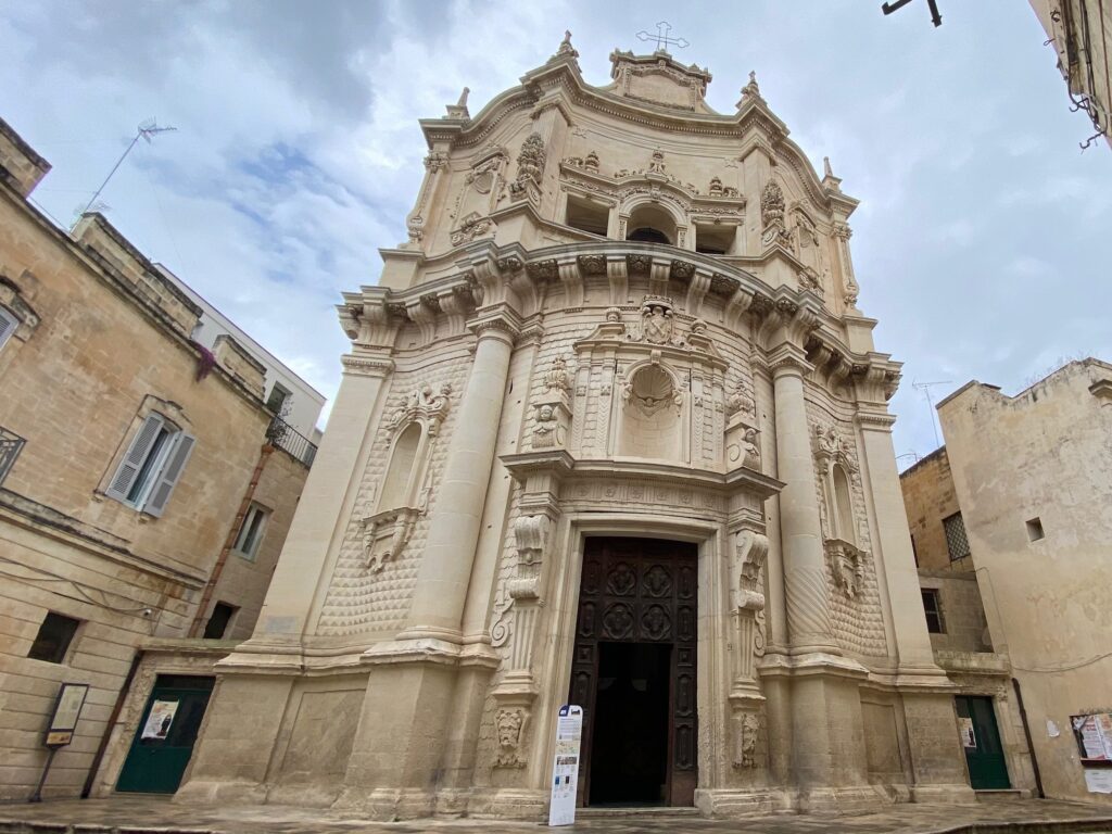 La façade de l’église de San Matteo est impressionnante, avec des sculptures et des décorations complexes qui témoignent de l’art baroque leccese. Elle présente également des éléments gothiques, notamment un portail orné de motifs délicats.