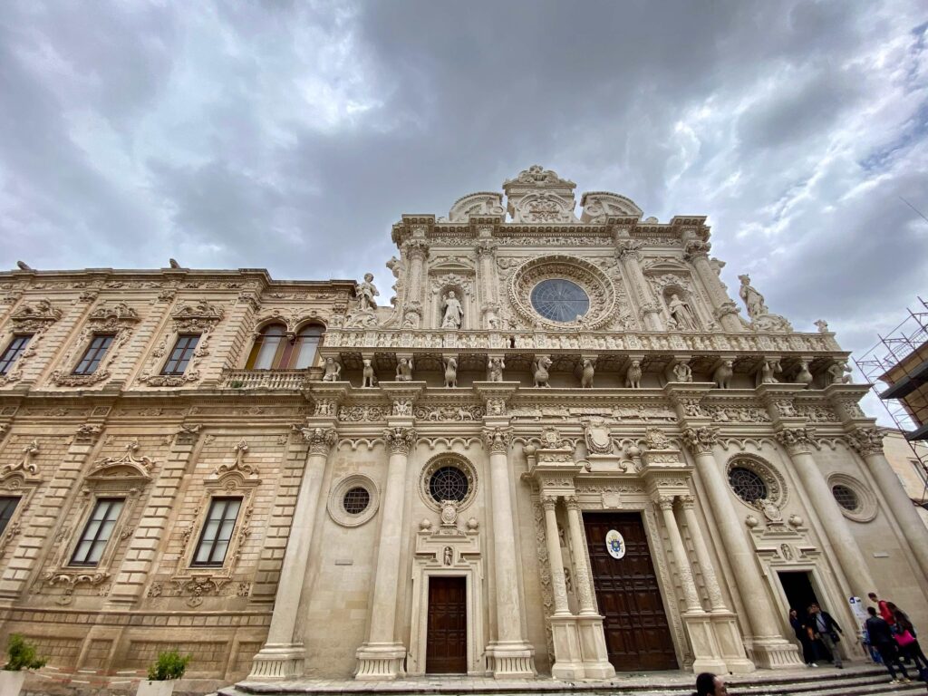 La façade de la basilique de Santa Croce est un chef-d’œuvre baroque avec une profusion de décorations sculptées et de détails architecturaux complexes. Les sculptures représentent des figures bibliques, des symboles chrétiens et des motifs ornementaux, créant une façade richement ornée qui attire l’attention des visiteurs.