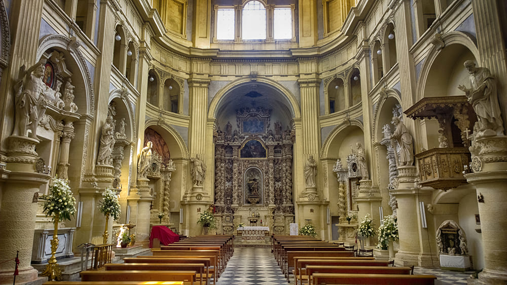 L’intérieur de l’église est tout aussi impressionnant, avec une décoration somptueuse qui comprend des fresques, des stucs élaborés, des autels en marbre et des chapelles latérales richement ornées