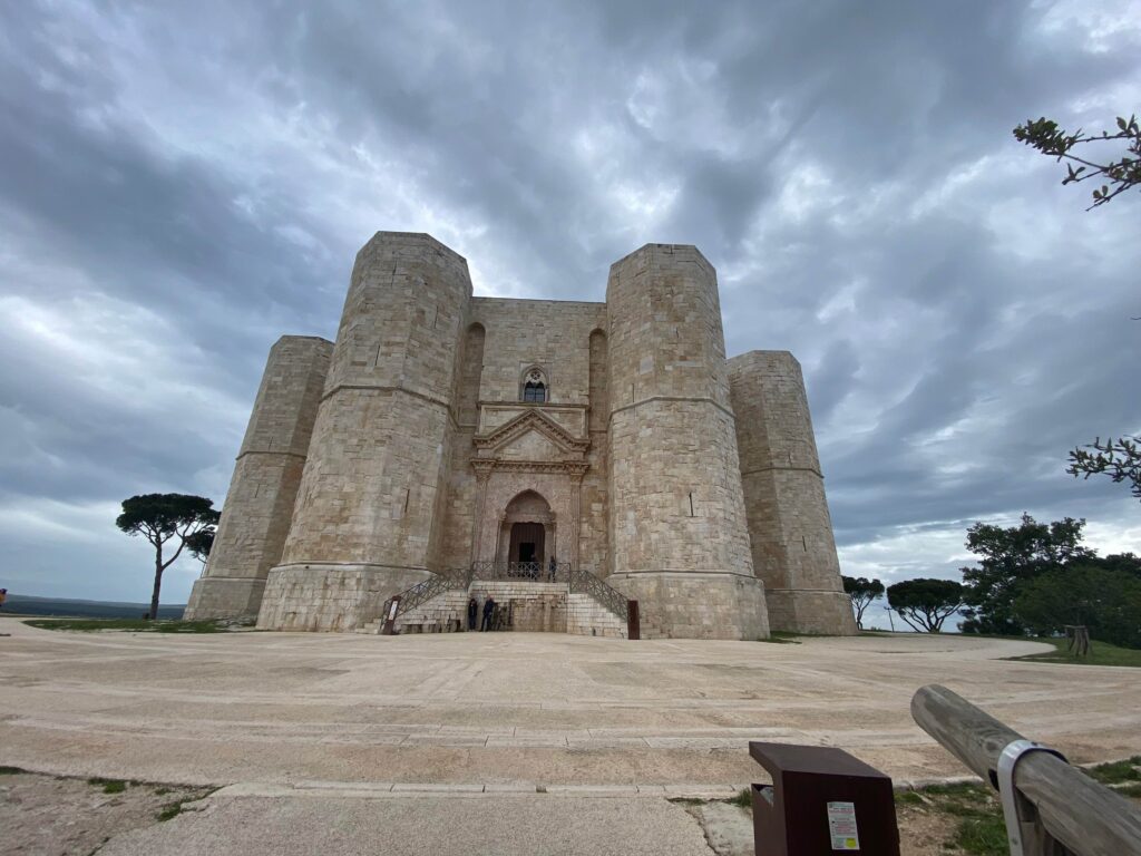 Le Castel del Monte se distingue par son architecture unique et mystérieuse. Il possède une forme octogonale parfaite, avec huit tours identiques aux angles et huit salles disposées autour d’une cour centrale. Les murs sont ornés de sculptures et de motifs géométriques.